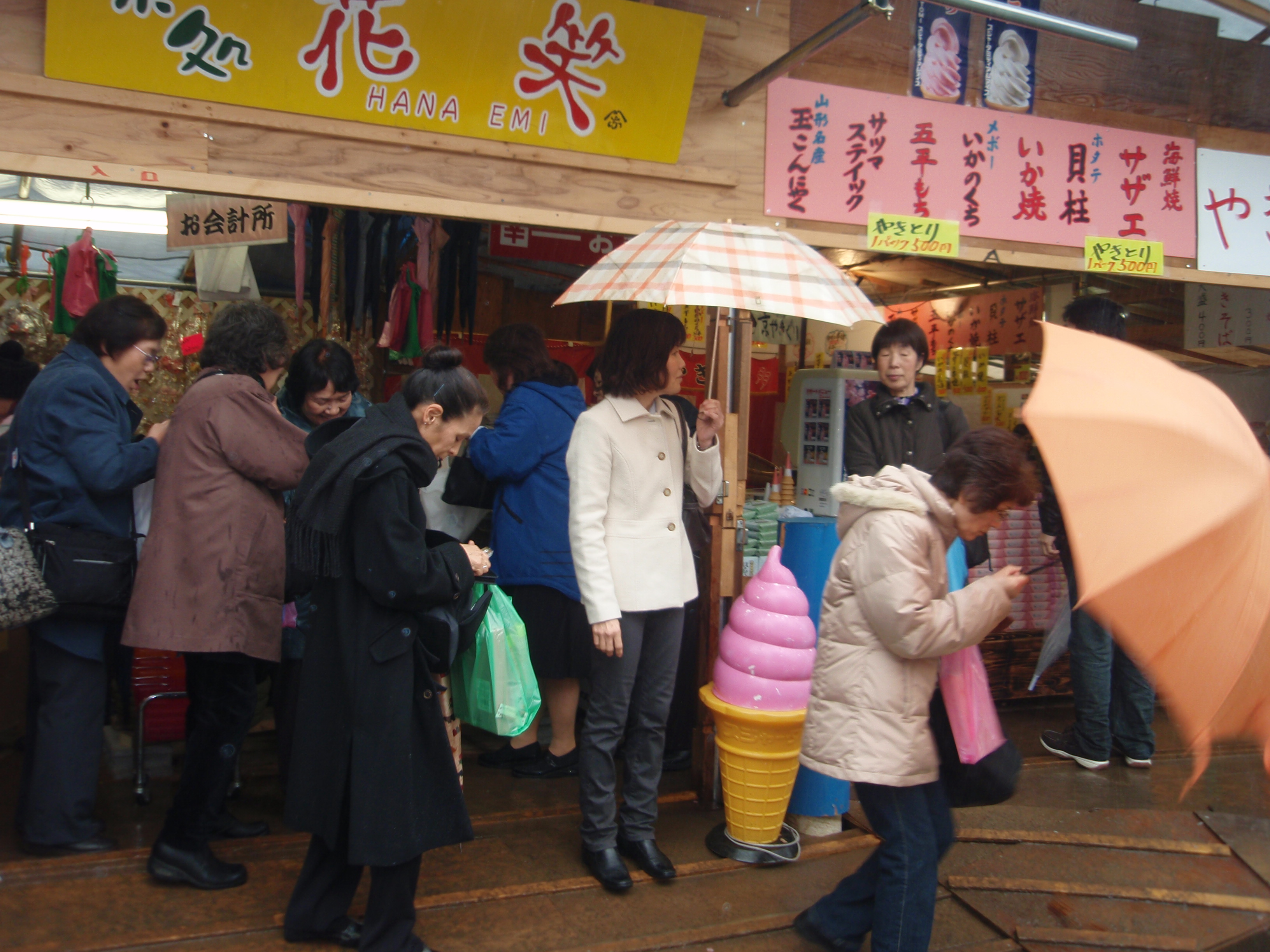 桜並木沿いにお店がたくさん出ていて、おばさまたちは飲んだり、食べたり、おみやげ買ったり大忙し