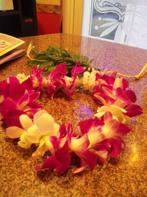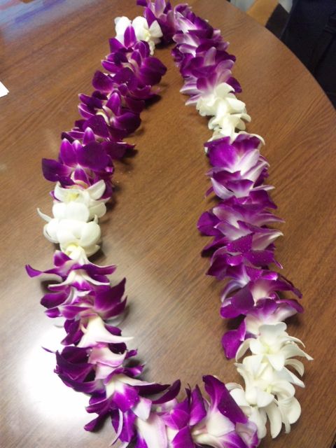 デンファレの花を合計110個も使ったレイとハク。