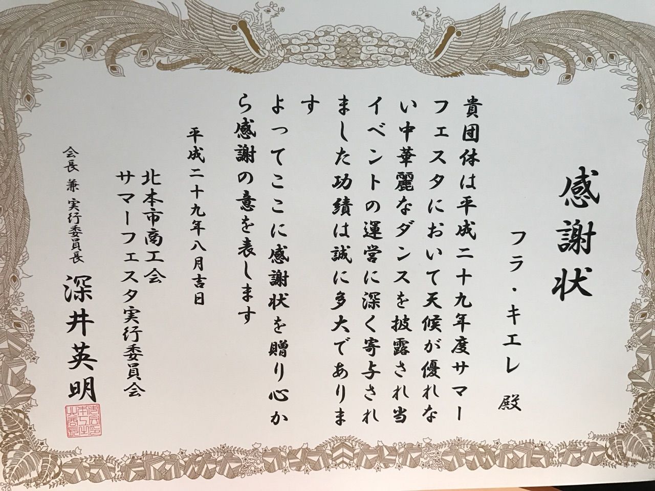 フラで感謝状をいただけるなんて、思ってもみませんでした。