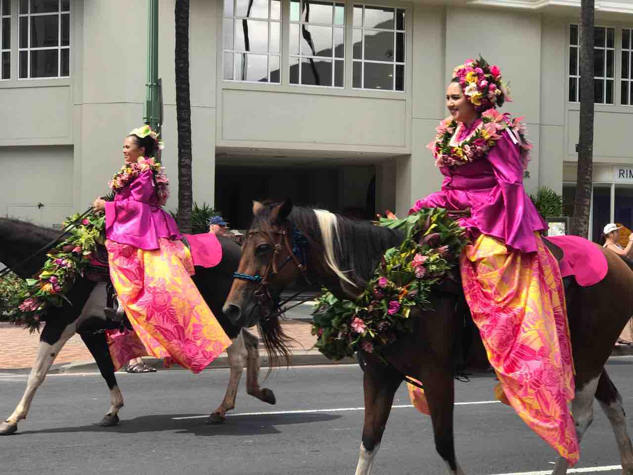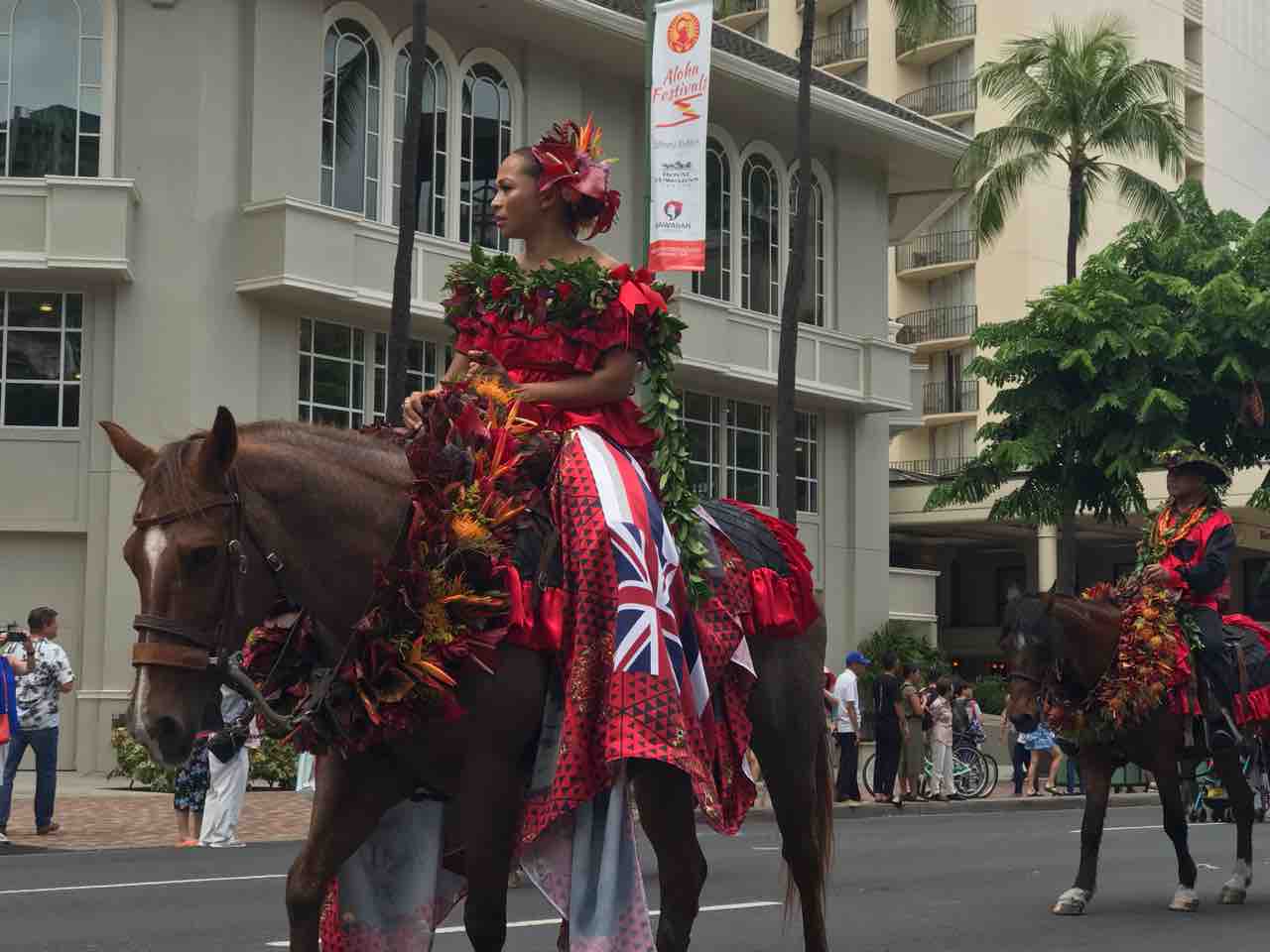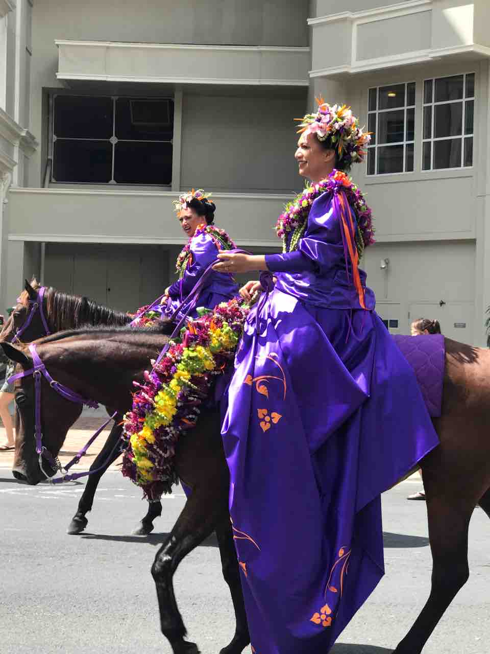 島ごとに、クイーンが島のカラーのドレスを身にまといお馬さんに乗って❤️