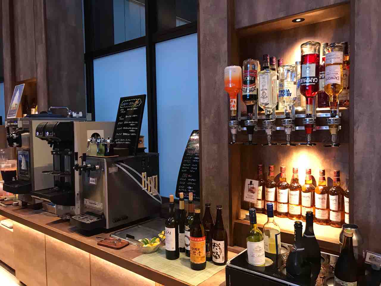 ラウンジにはドリンクバーにたくさんの種類のお酒が。