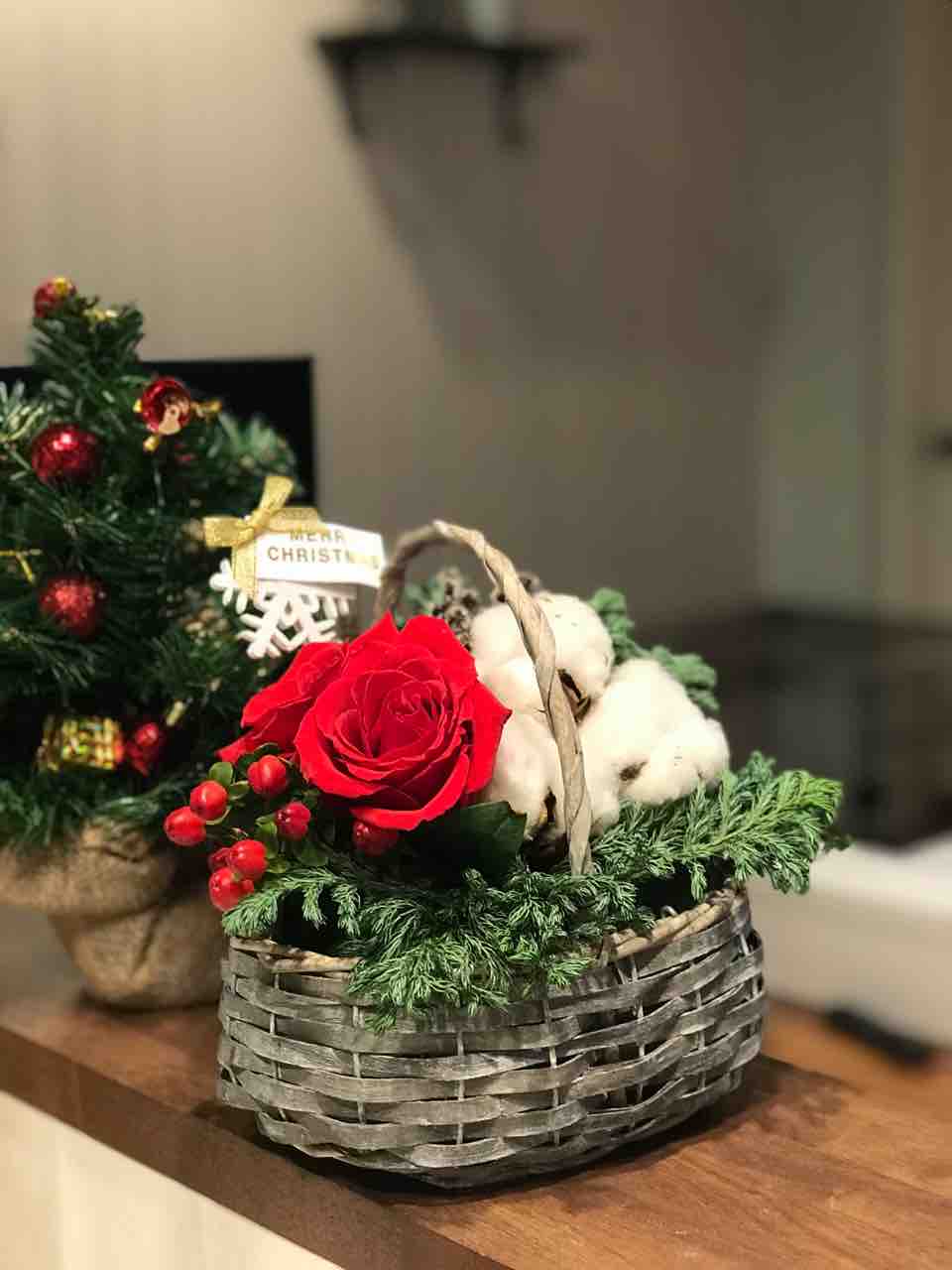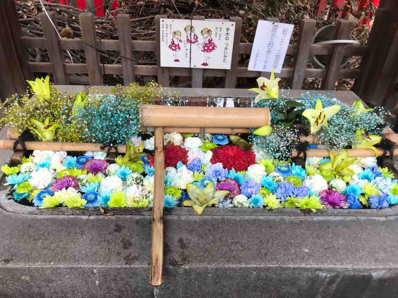 会社の氏神様に今年のお礼に行ったら、花手水がありました。
