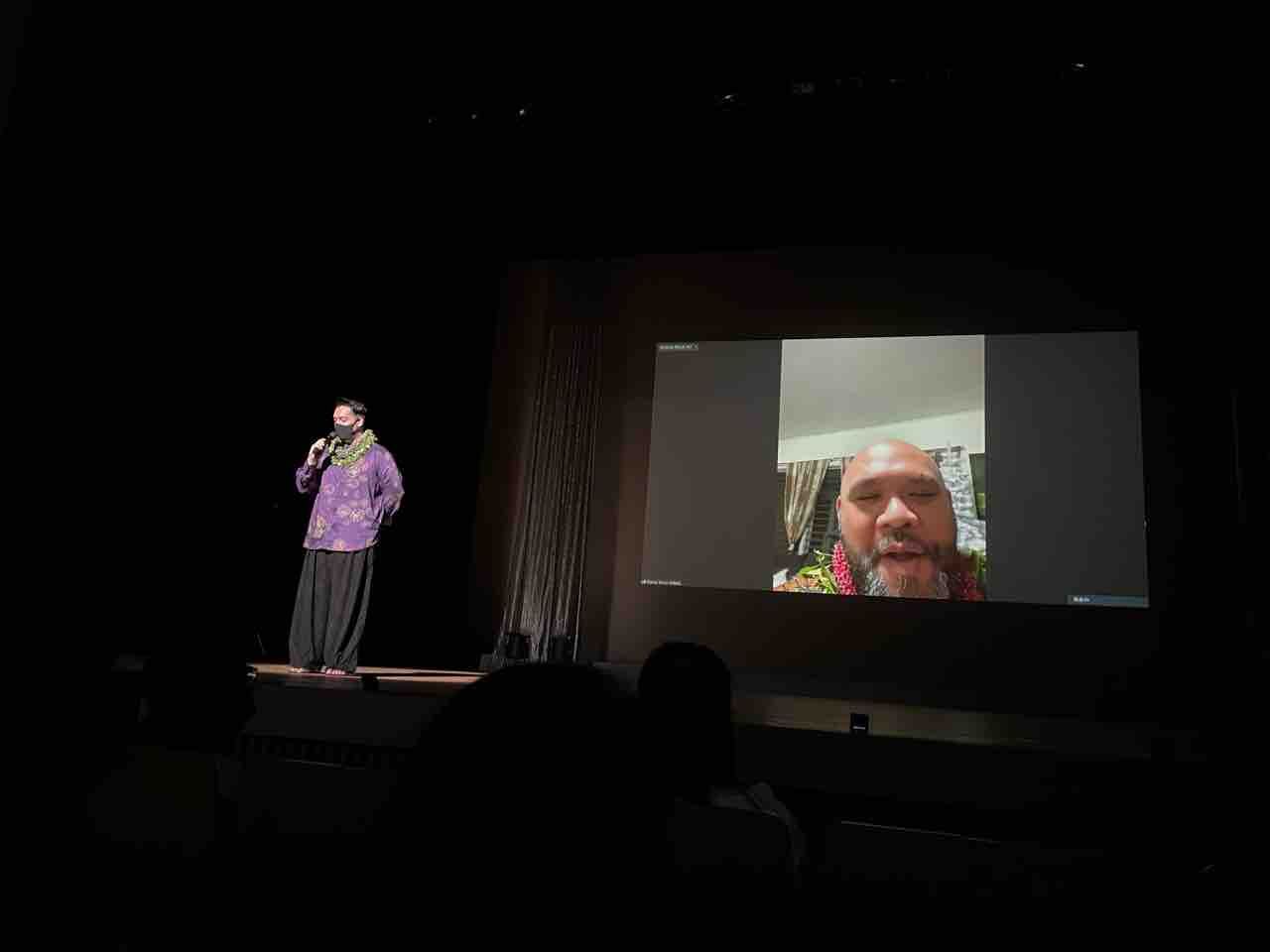 ハワイとリアルタイムで繋がって、MCのカラニさんとゲストのミュージシャンのトーク。