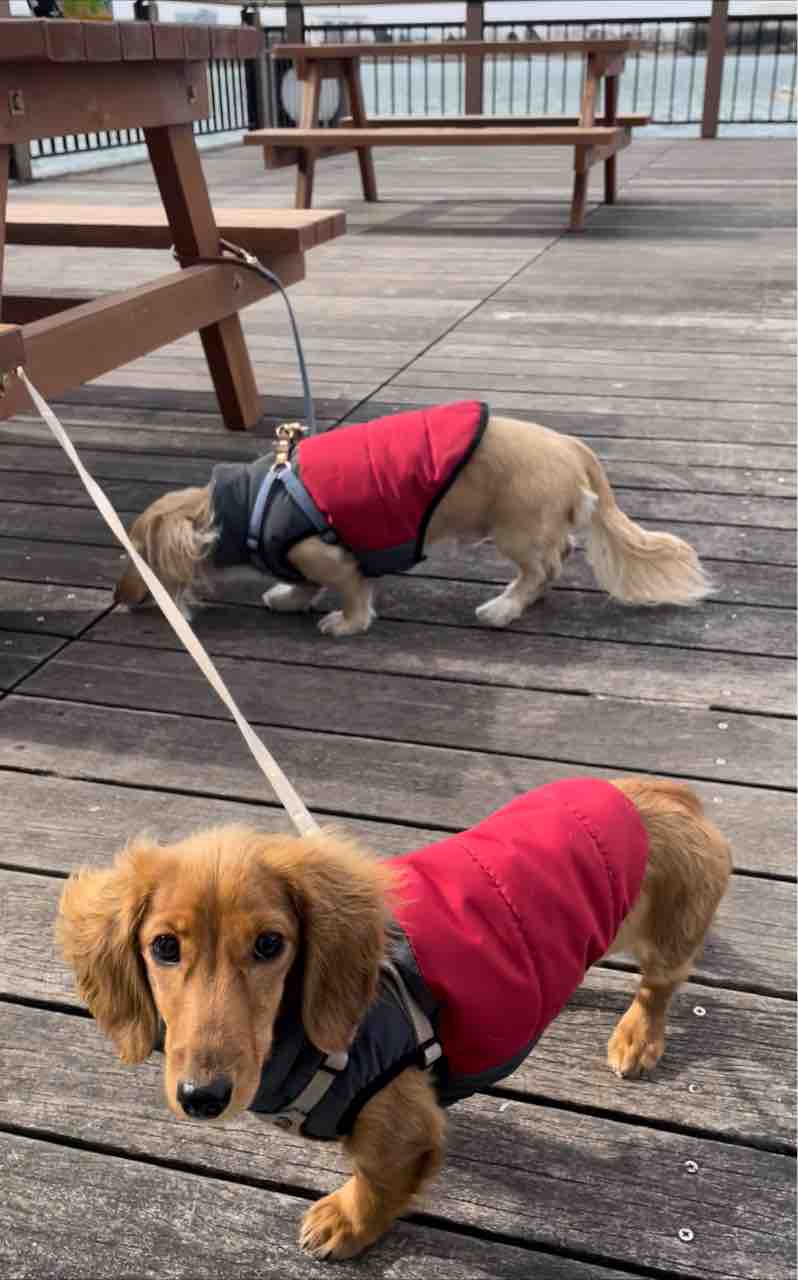 今日もレッスンの換気の時間に、散歩に行く二人がスタジオに顔を見せたんだけど、マナちゃんは人がいっぱいいるのが怖いみたいです。