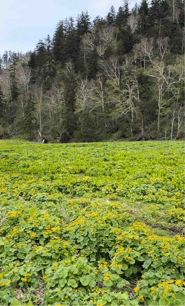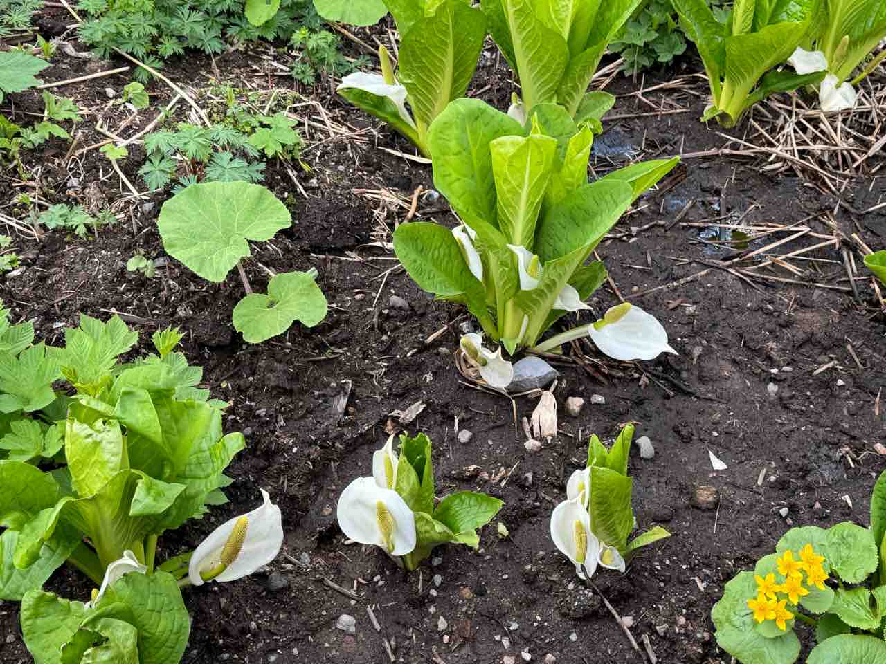見たことのない黄色いお花と水芭蕉がたくさん咲いていました。