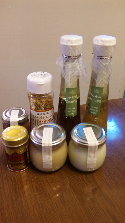 後列左から、つまみそ、フライドオニオンフレーク、醤油まいたけドレッシング、バジルドレッシング、前列左から善光寺七味唐辛子、キャラメルクリーム、バニラクリームです。