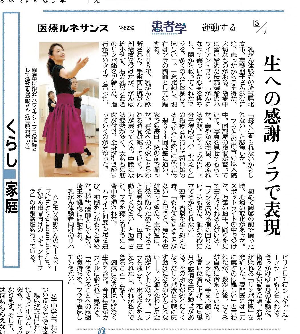 朋子さん!読売新聞見ました‼写真も素敵でとても若返ってますよね。乳ガンの医療誌の時より若く見えます‼
