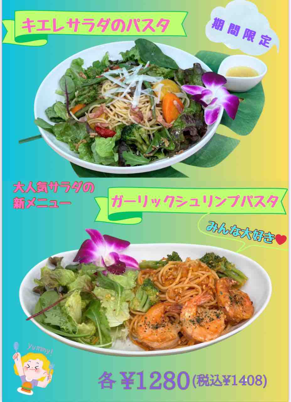 まずは、2周年イベントで大好評だったガーリックシュリンプパスタと、もう1種類、「キエレサラダのパスタ」が8日(土)からスタートします❣️