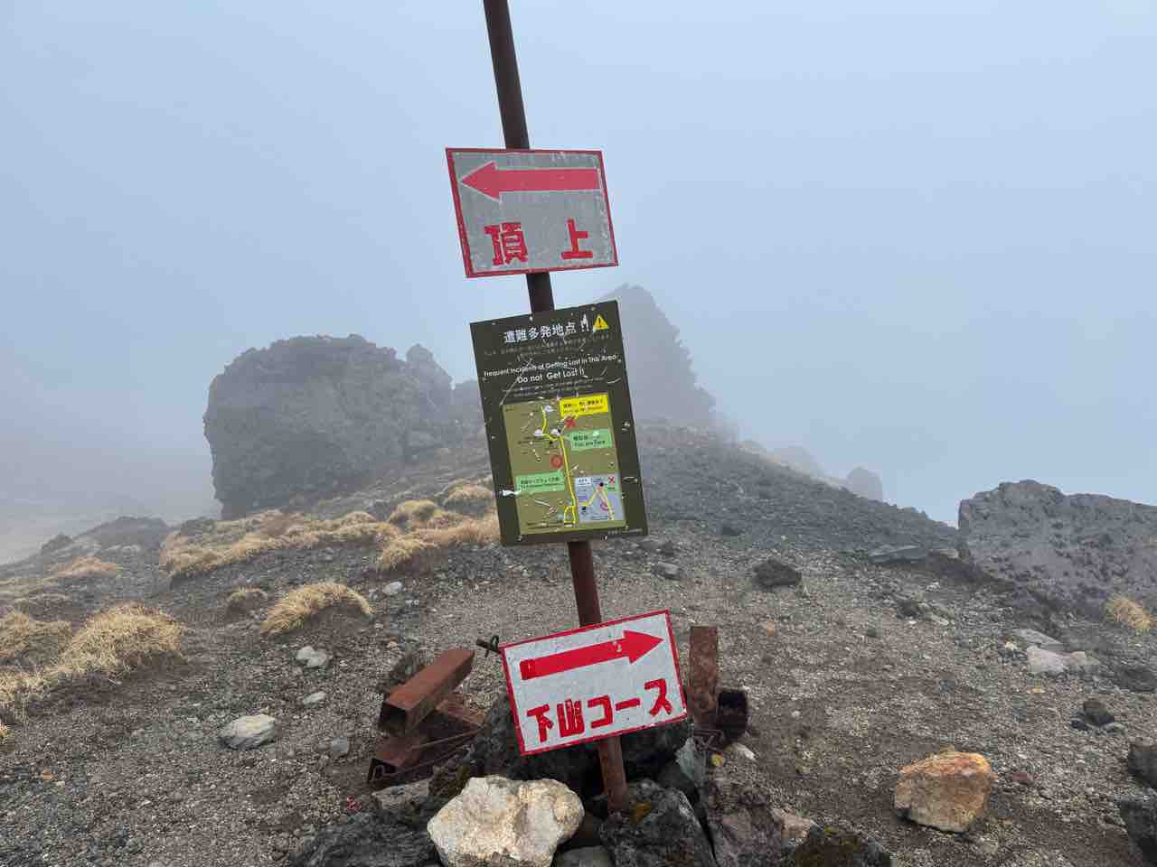 ちょうどその頃ガスってきて何も見えなくなり、強風が吹いてきた💦