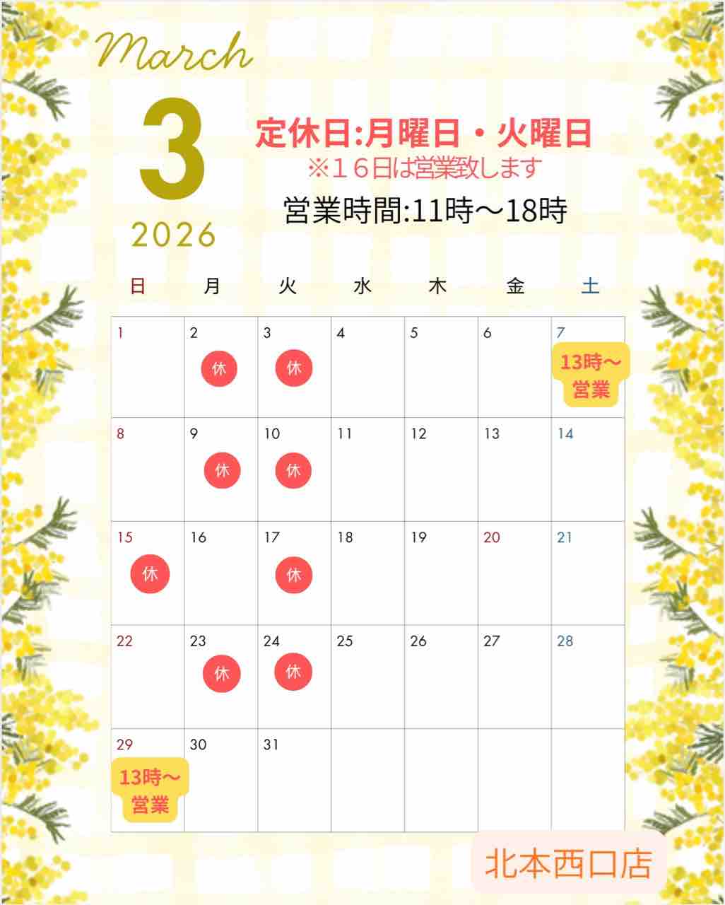西口店、、月曜、火曜がお休み(祝日の場合は営業、翌日がお休み)