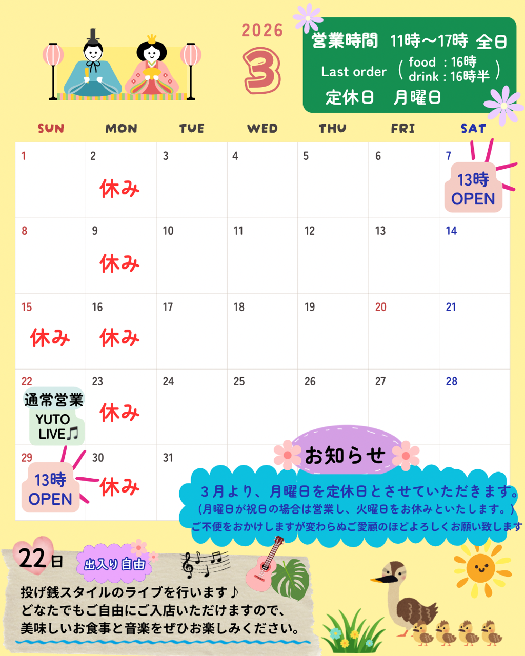 ブログでのお知らせが遅くなりましたが、3月からカフェの営業日が変更になります。