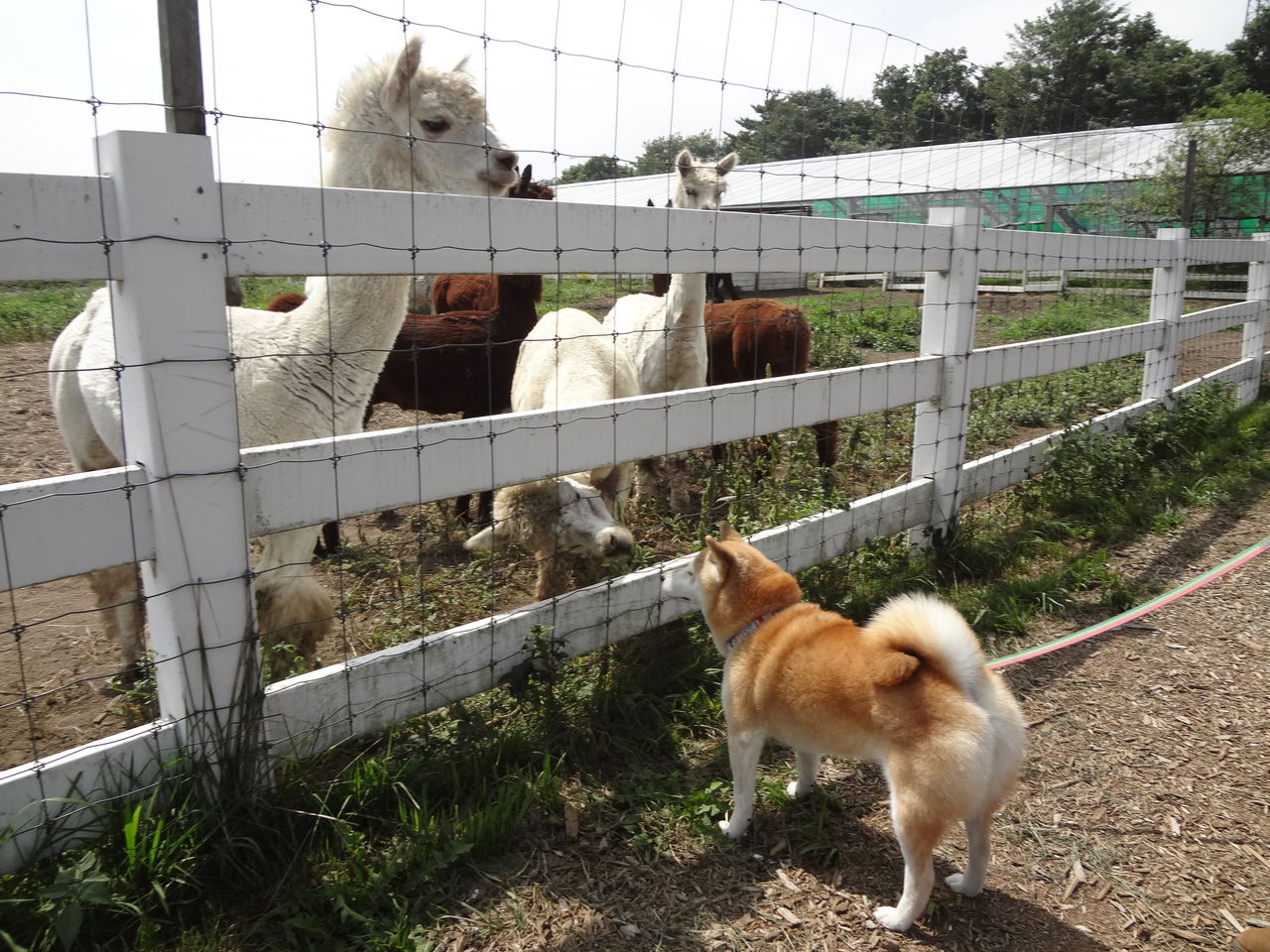 柴犬に、興味津々のアルパカたち↓