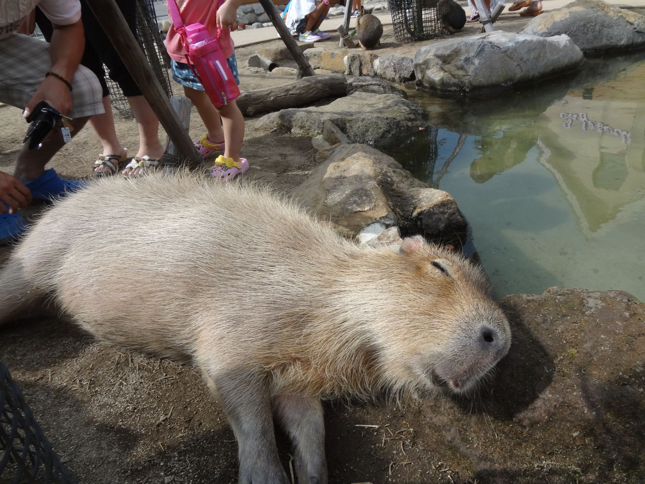 子供たちに混じってカピバラにえさをあげたり